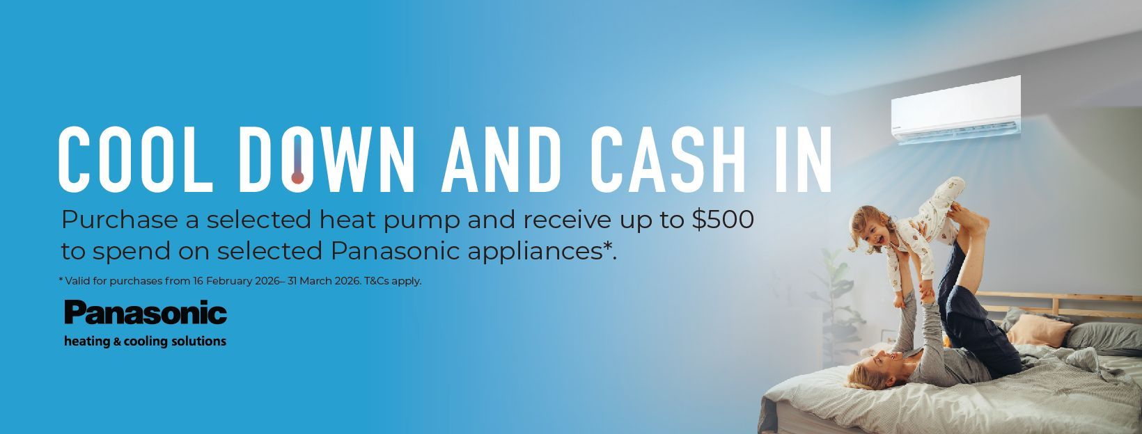 Right now, when you purchase a selected Panasonic heat pump from Butler & Hewitt between 16 February and 31 March 2026, you’ll receive up to $500 credit to spend on selected Panasonic appliances.*